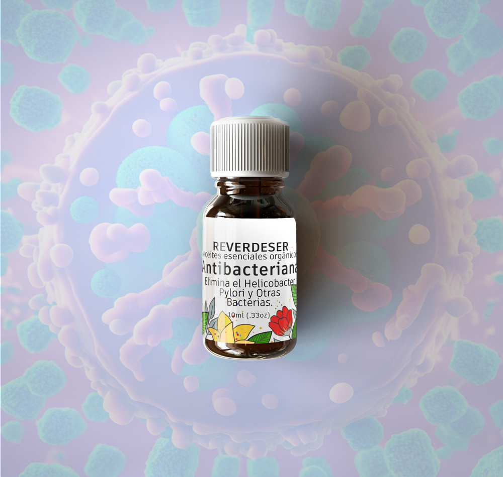 Antibacterial: Potente mezcla de aceites esenciales orgánicos con propiedades antibióticas que ayudan a disminuir los efectos de infecciones  bacterianas como Helicobacter pylori o E. Coli.